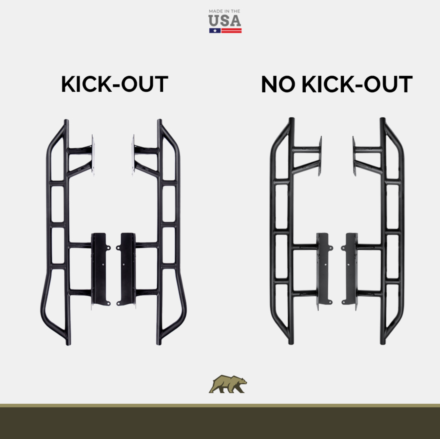 Choose between kick-out or no-kick-out, from RAW, Powder Coat, and Bedliner finishes. More options than any other supplier on the market!