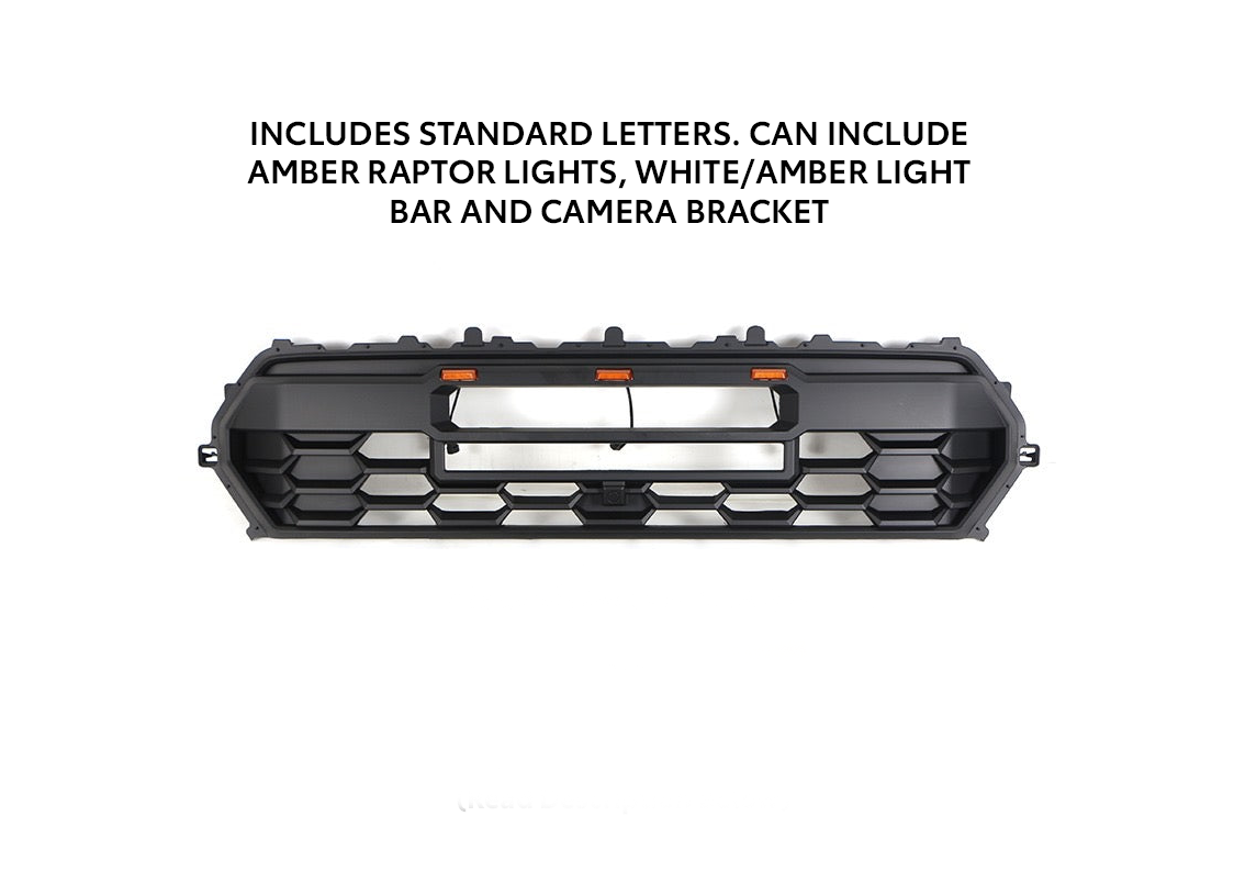 Style-up your 4th generation Tacoma with our all-new aftermarket Pro Grille. Get the same stylish look as the 2024+ Pro Tacoma without the high cost. This grille directly replaces the factory grille with no modifications needed. Sporting a matte black finish, it easily matches the black factory trim. We also offer color matched and gloss black to match your 4th Gen Tacoma's color. Choose between a grille with front marker lights or without, also known as raptor lights. Our Pro Grille has the option to come with or without a light bar. It also includes silver letters, and all necessary wiring. It is also compatible with front-facing cameras if your 4th Gen Tacoma is equipped. We also offer color matched letters too!
