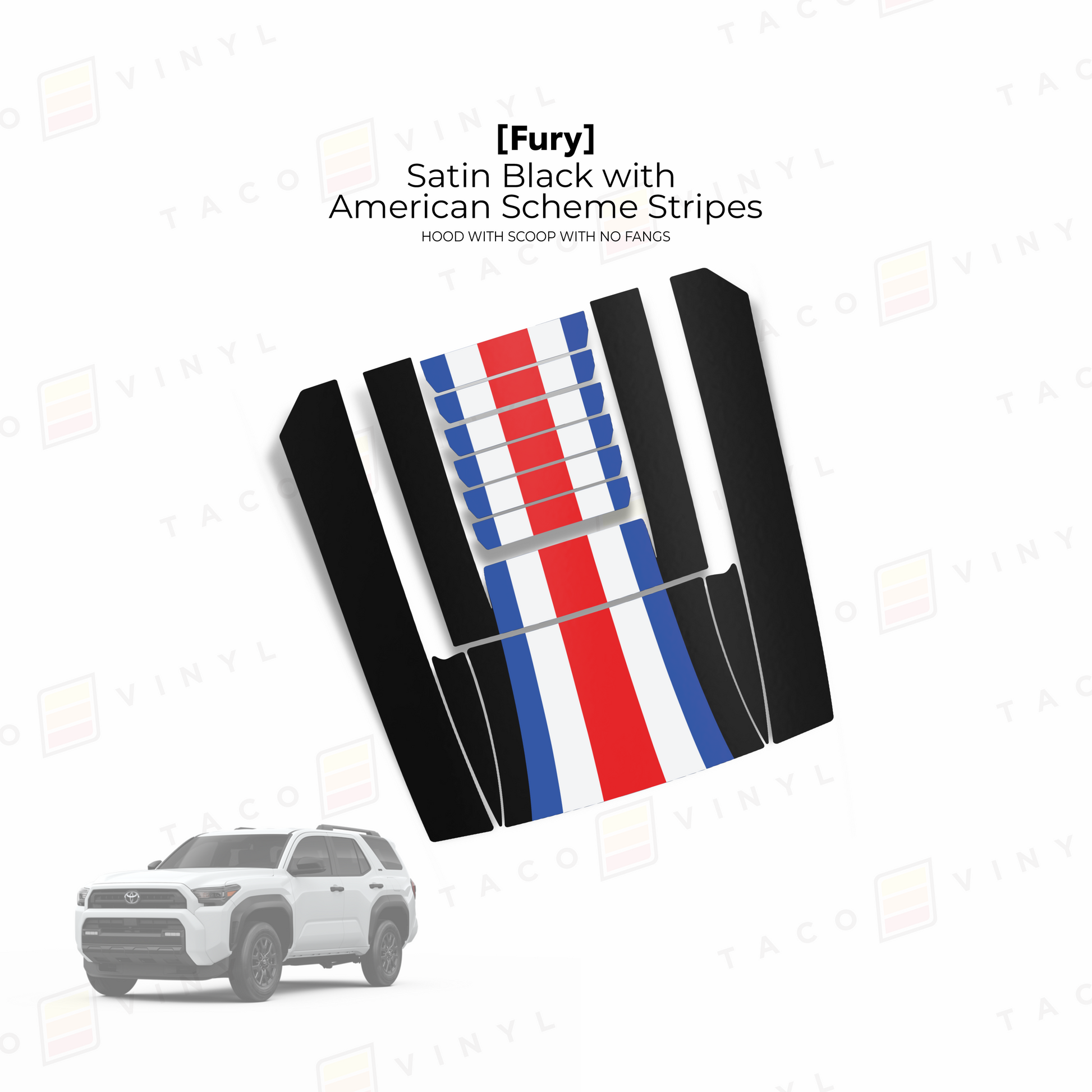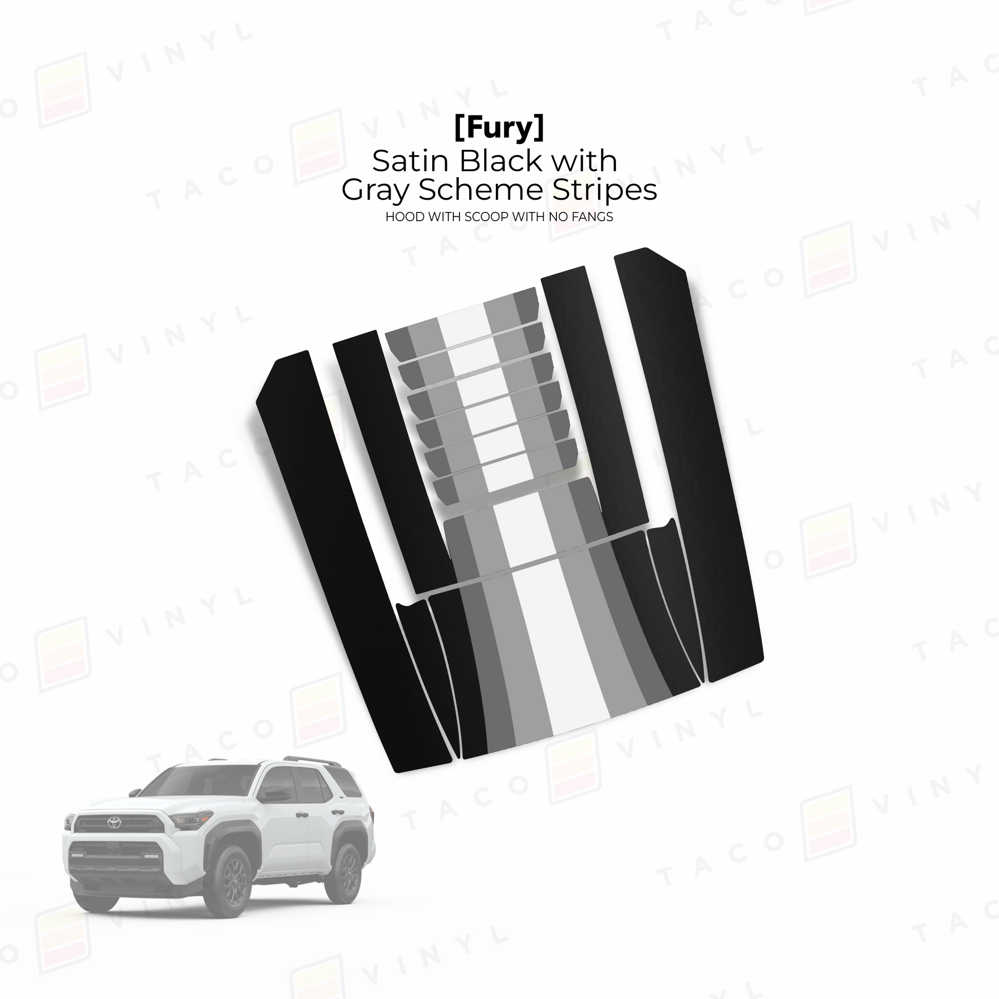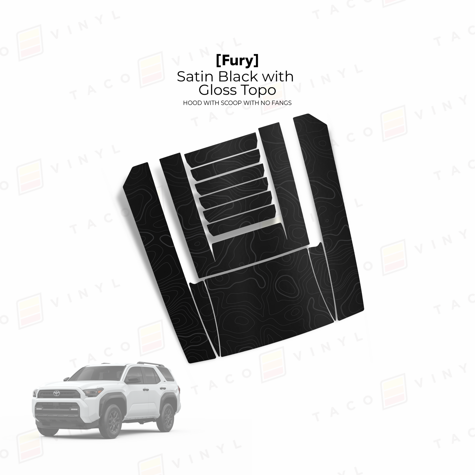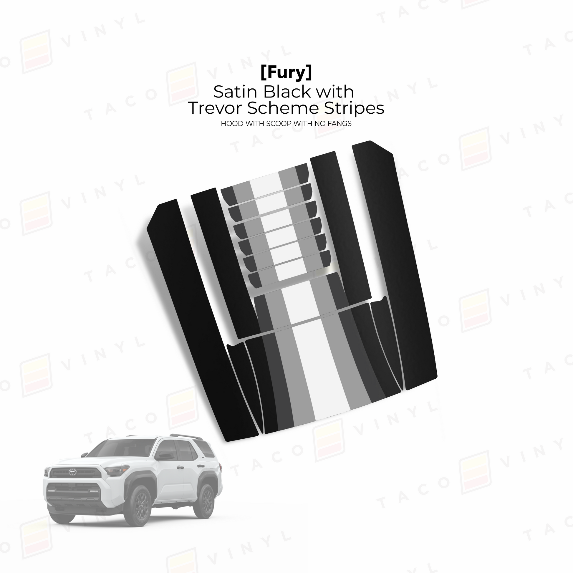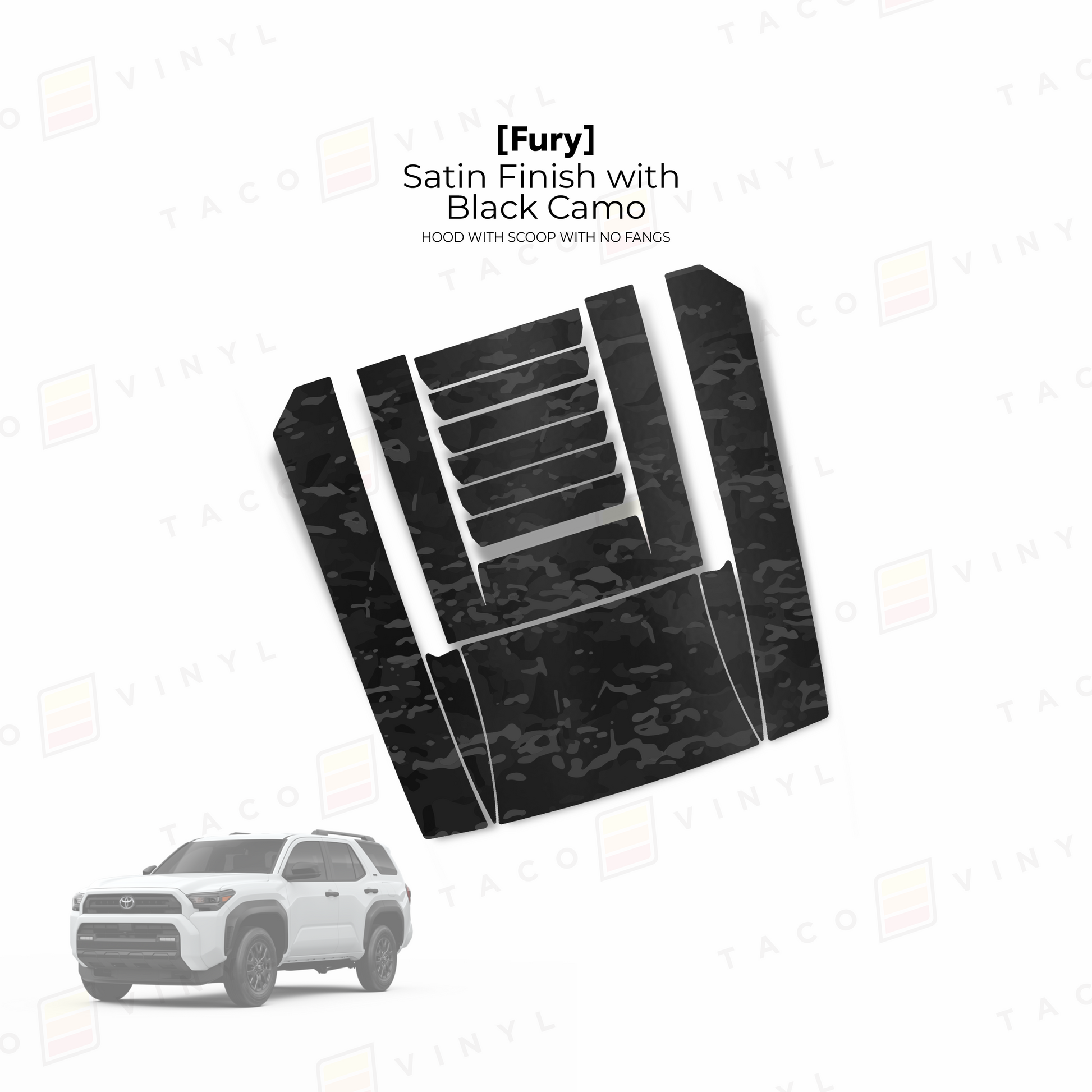 Give your 6th Gen 4Runner hood a bold upgrade with our Fury hood stamp decal kit with no fangs! This kit includes 12 pieces that match your truck’s body lines seamlessly and is made from premium materials. The decals come with application tape for easy alignment. Choose from a range of designs and colors, and install it yourself using our YouTube guide or have a local wrap shop handle the installation for you.